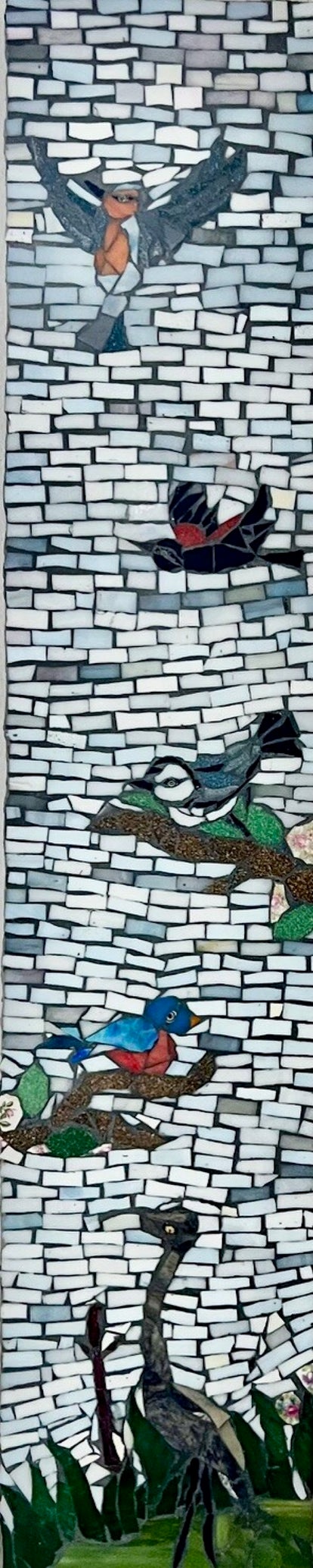 6" by 30" mosaic panel, birds against a white background. On foam core backer board, grouted and sealed edges, wire for hanging