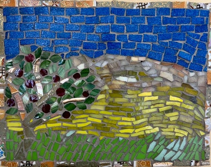 An apple tree and green and yellow fields in a dark blue dawn sky. Made of glass and china. Self framed with china pieces. 9" by 11" on foam core backer board with D-ring installed.