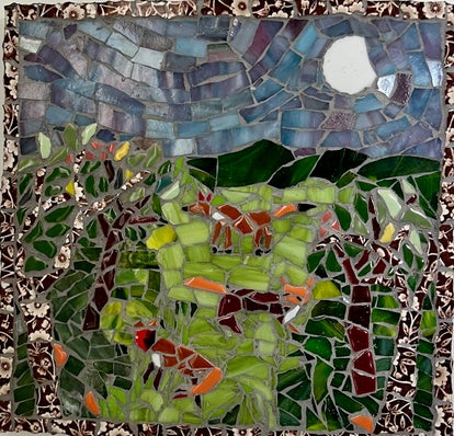 10" by 12" mixed media mosaic. Foxes by moonlight in the forest. On foam core backer board with d-rings and wire installed.