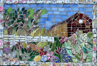 12" by 14". Mixed media and found pieces mosaic. In late summer when the jasmine spreads on the back fence underneath the tall sunflowers and air is full of scent. On foam core backerboard, sides and back finished, wire hanger installed.