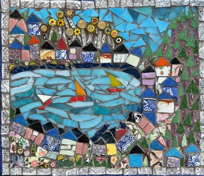 10" by 12" mixed media mosaic using glass, china, porcelain and pottery. colorful summer in the mountains, with a lake, sailboats, flowers and evergreen trees. On foam core backer board, sealed and grouted and with D-rings and wire installed. Very lightweight for hanging.