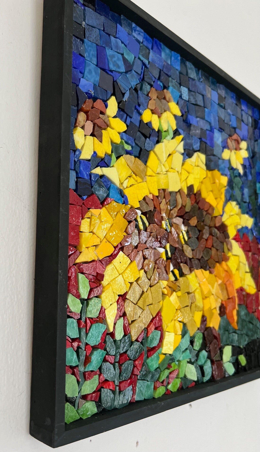 Bees sleeping in a sunflower, the tenderness and brightness of late summer blooms. 12" by 12", made of hand cut smalti in a painted green/black frame with sawtooth hanger installed. 4lbs.