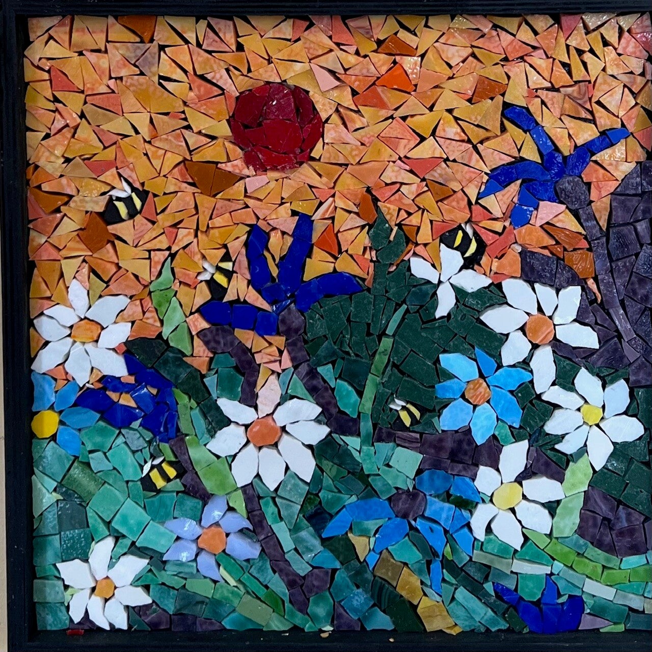 12" by 12" hand cut smalti glass of a summer meadow with bees, flowers, grasses and an orange sky. Ungrouted. In a wood frame deep green-black with sawtooth hanger mounted